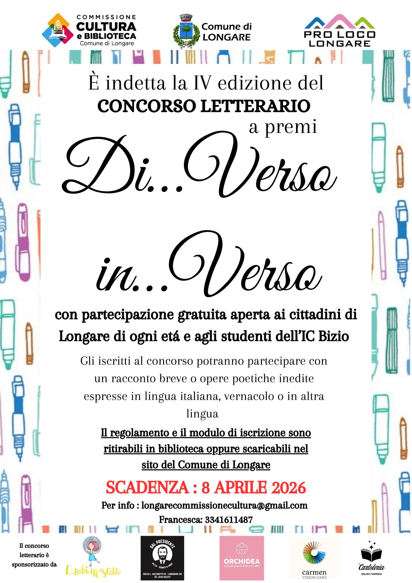 La Commissione Cultura e Biblioteca del Comune di Longare, in collaborazione con la Pro Loco Longare e con il patrocinio del Comune di Longare bandisce la quarta edizione del concorso letterario denominato “Di…verso in…verso” riservato a ragazzi e adulti residenti nel Comune di Longare o frequentanti l’Istituto Comprensivo “B.Bizio” di Longare che potranno partecipare, alternativamente, con opere poetiche inedite espresse in lingua italiana, in vernacolo o in altra lingua e con forma e metrica letteraria a scelta oppure con un racconto breve, in lingua italiana, in vernacolo o in altra lingua, limitato a massimo 3600 battute. Le opere redatte in lingua diversa dall’italiano dovranno essere corredate da traduzione, pena esclusione dal concorso.