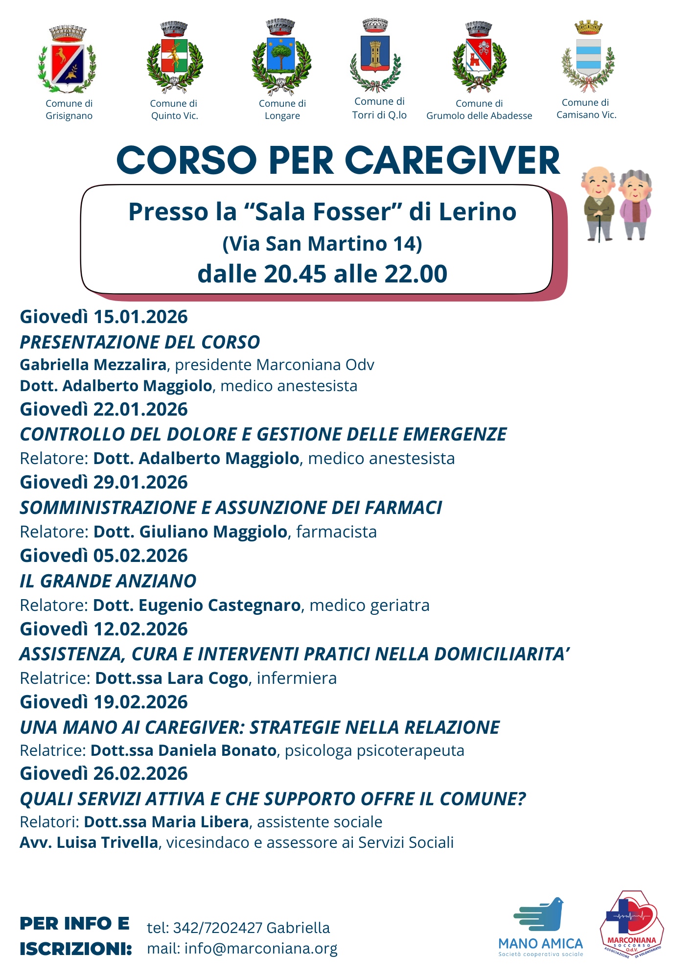 L'organizzazione di volontariato Marconiana Soccorso ODV organizza con il Comune di Torri di Quartesolo e il patrocinio dei Comuni di Grisignano di Zocco, Quinto Vicentino, Longare, Grumolo delle Abbadesse, Camisano Vicentimo, un corso dedicato alla formazione per Caregiver