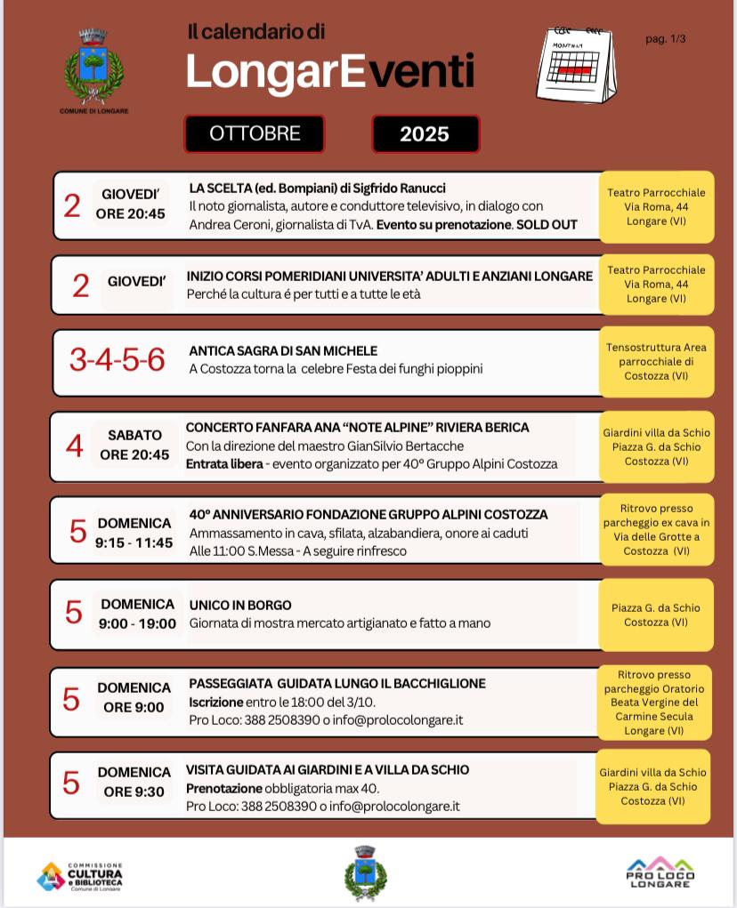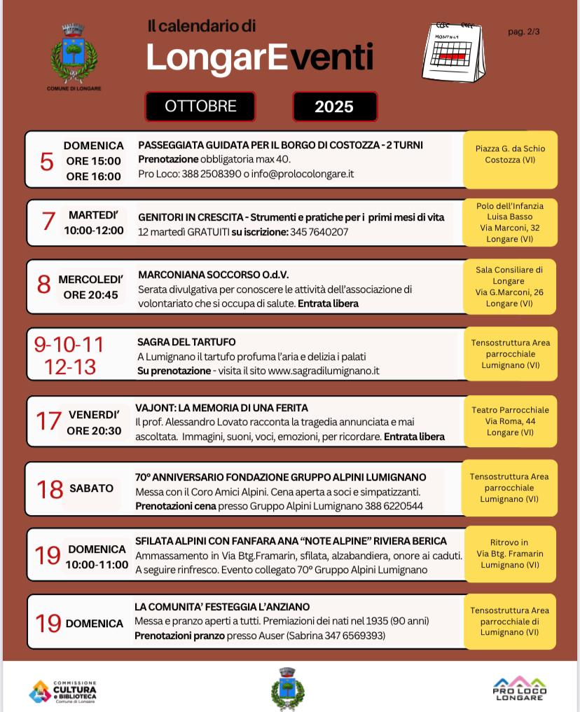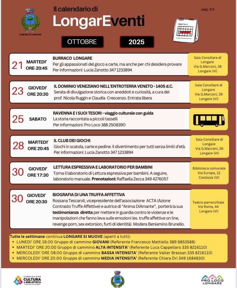 un mese di ottobre ricco di occasioni di incontro, a cura della Commissione Cultura e Biblioteca, Pro Loco Longare, Associazioni Sportive
